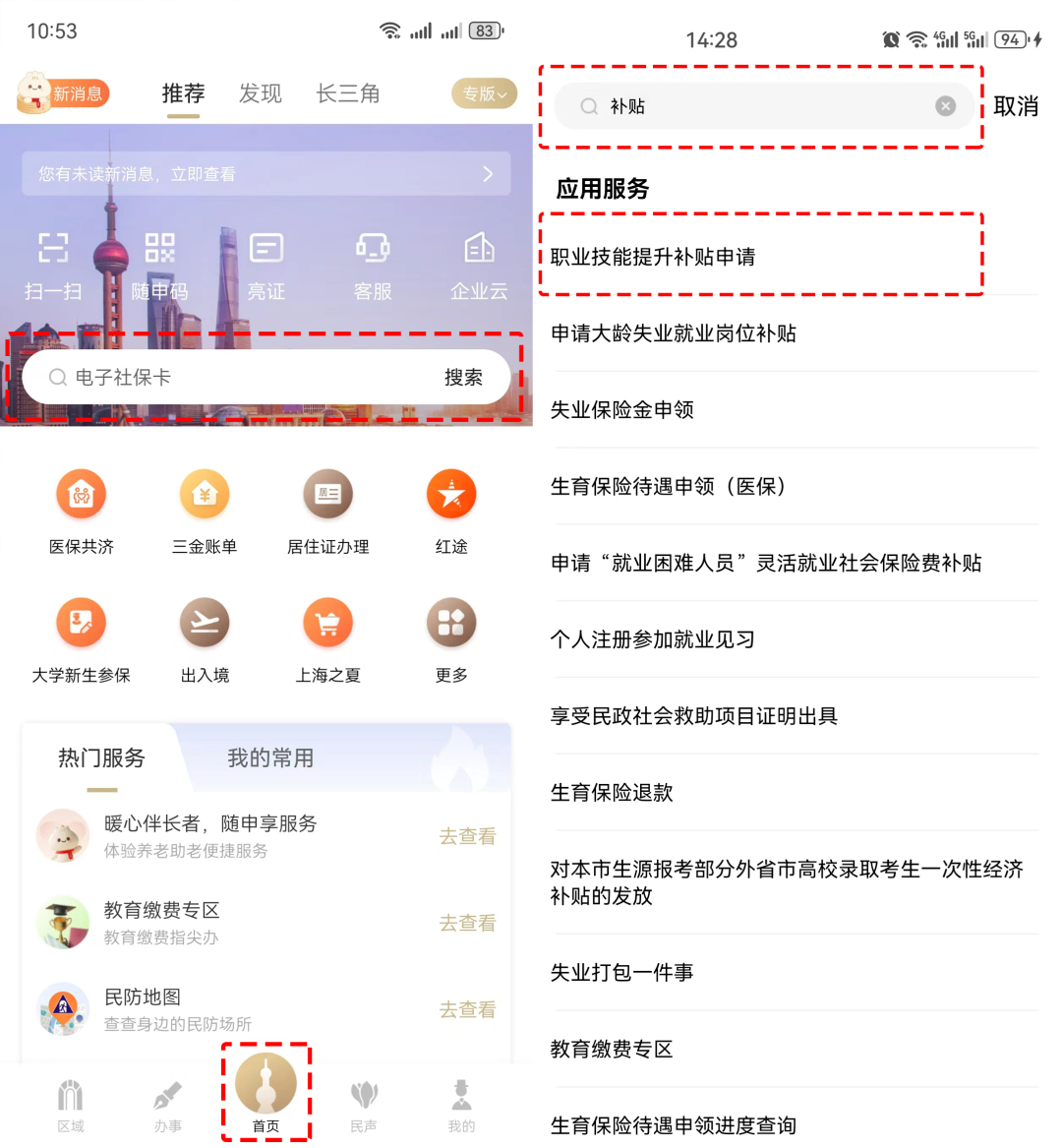 1、打开“随申办市民云”APP→首页搜索框中输入“补贴”→点击“职业技能提升补贴申请”进入服务页面;