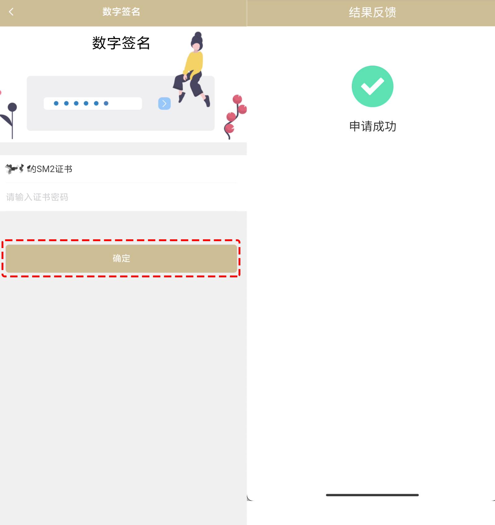 3、完成数字签名后,点击“确定”,即申请成功。