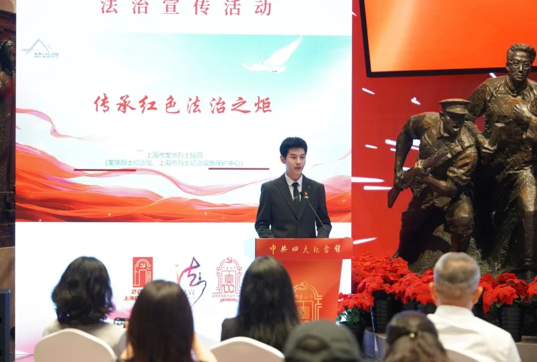 龙华烈士陵园讲解员赵飞作为法治宣讲员,围绕“传承红色法治之炬” 主题展开宣讲。通过讲述龙华英烈在革命时期探索法治建设的事迹,生动诠释红色法治基因的内涵,让听众深切感悟早期法治实践的精神内核。