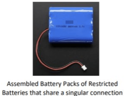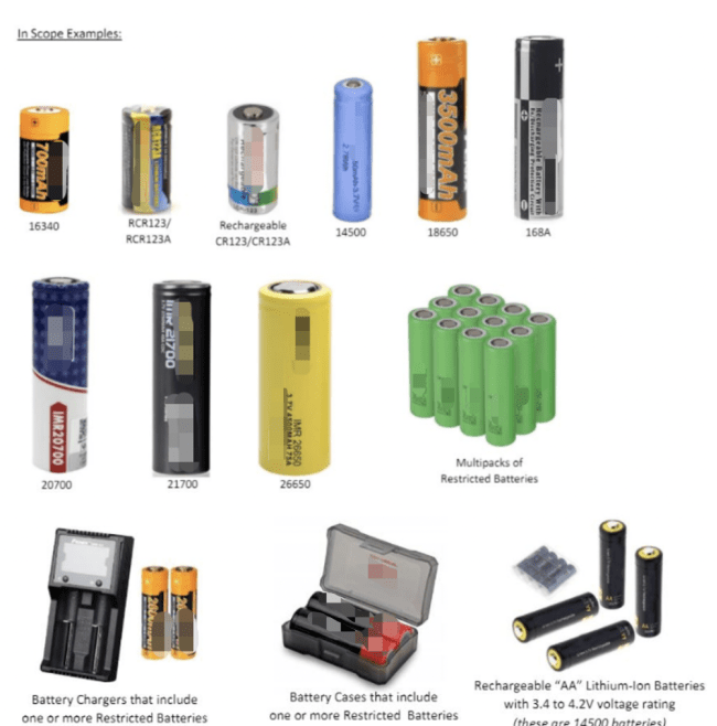 独立销售的受限电池是指在电池组件之外销售的单个/独立电池或者跟设备(i.e.充电器,电池盒等)一起售卖的受限电池(如下图)。