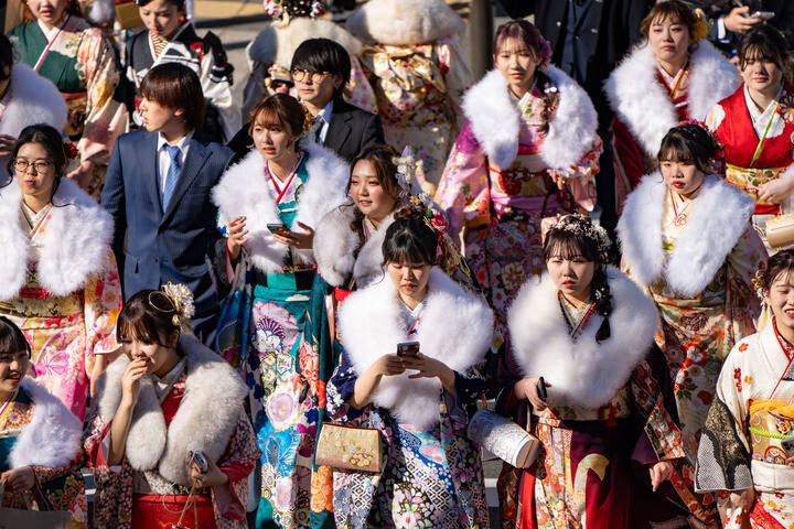这是1月8日在日本横滨拍摄的准备参加成人礼仪式的青年男女。新华社记者张笑宇摄