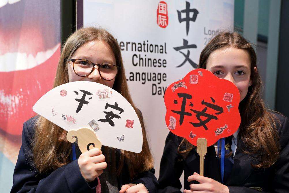 2023年5月11日,在英国伦敦,学生在2023“国际中文日”英国主题活动上展示自己的书法。新华社记者李颖摄