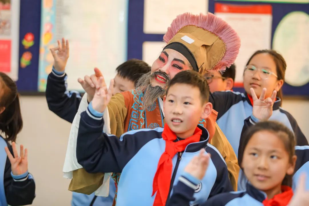 山东省青岛东川路小学,吕剧演员指导学生学习吕剧基本动作。