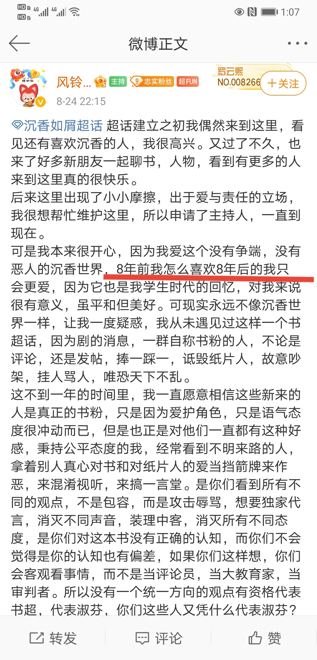 ②原主持装书粉抢微博书超,自称自己八年书龄,结果被人找出20年底才看书的发言。这毫无公正性的帖子还被搬运到豆瓣剧专组加精,以此给书粉扣黑子的帽子。