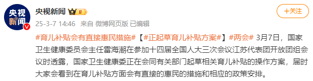 随后,3月7日,据央视新闻微博消息,国家卫生健康委员会主任雷海潮在参加十四届全国人大三次会议江苏代表团开放团组会议时透露,国家卫生健康委正在会同有关部门起草相关育儿补贴的操作方案,届时大家会看到在育儿补贴方面会有直接的惠民的措施和相应的政策安排。