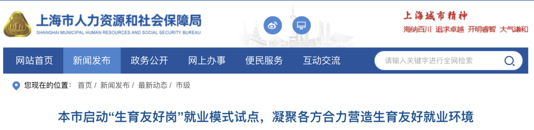 上海市人社局、市总工会、市妇联联合印发《关于开展“生育友好岗”就业模式试点工作的通知》,鼓励用人单位采取有利于平衡工作和家庭关系的措施,积极营造生育友好型工作环境。