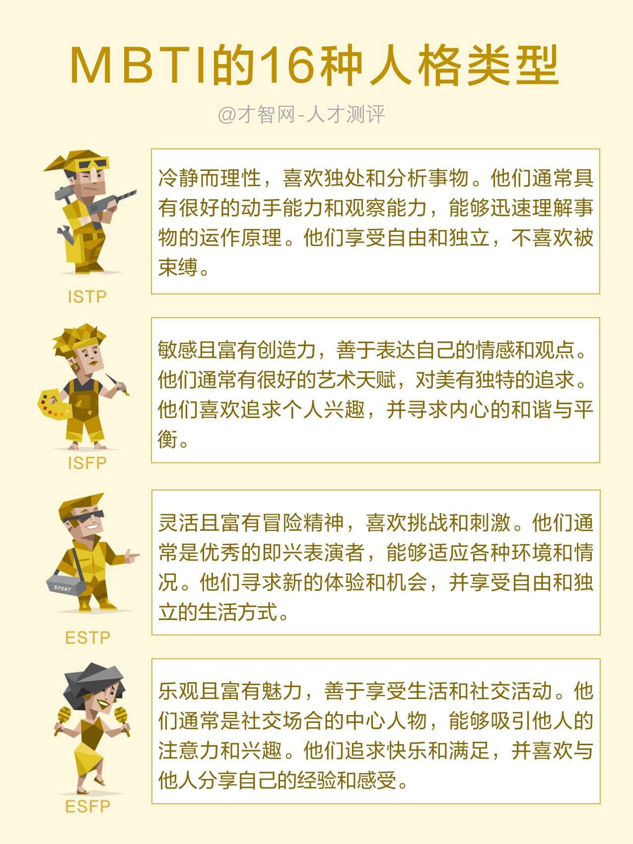 ISFP(艺术家):敏感且富有创造力,善于表达自己的情感和观点。他们通常有很好的艺术天赋,对美有独特的追求。他们喜欢追求个人兴趣,并寻求内心的和谐与平衡。