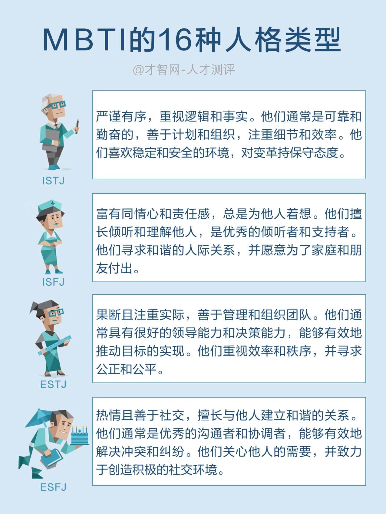 ISTJ(监督者):严谨有序,重视逻辑和事实。他们通常是可靠和勤奋的,善于计划和组织,注重细节和效率。他们喜欢稳定和安全的环境,对变革持保守态度。