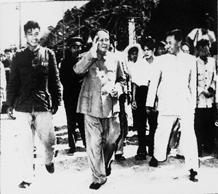 10点多,毛主席登上指挥部事先准备好的大木船,泛舟水面,两岸群山清晰可见。主席看着山上的长城烽火台说:“他们的长城修得再牢固,也不能挽救因腐败而覆灭的命运。我们就聪明多了,不再搬石头修长城,而是修水库、搞建设,造福子孙。我们是为人民服务的,就会立于不败之地。”