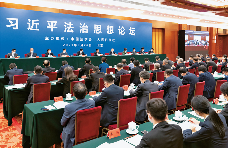 2021年9月26日,由中国法学会和人民日报社联合主办的习近平法治思想论坛在京举行。论坛以“坚定不移走中国特色社会主义法治道路,为全面建成社会主义现代化强国而努力奋斗”为主题,旨在推动社会各界特别是法学法律界认真学习、深入研究、扎实宣传习近平法治思想,自觉用习近平法治思想武装头脑、指导实践、推动工作,谱写新时代全面依法治国新篇章。 《民主与法制》社记者 戎珊/摄