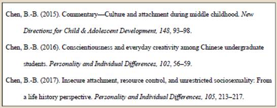 当数篇论文中,作者相同(必须是作者署名先后顺序一致)、发表论文的年份也相同时,文后文献的引列按照分配字母后缀原则。相应地,在正文引用中,就按照分配了英文字母后缀a、b、c的引用模式来处理。如: