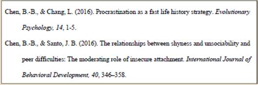 第二,期刊论文。基本的元素包括作者、出版年份、论文的标题、期刊名称、卷数、期名、页码。有时候一篇论文可能只有一位作者,还有时候作者不止一个,这时候我们在引用作者名的时候也有一些讲究。比如在APA格式里面,引用作者名,首先第一位作者的姓氏要写全,名字只要首字母就可以了。如果作者是两位及两位以上怎么办呢?如果有2位至7位作者,那么如同第一位作者一样,需要一一列出作者姓名,每一位作者之间用“,”隔开,并且最后一位作者之前用“&”连接。例如,总共三位作者,那么应该是“Chen, B.-B., Li, D., & Santo, J. B.”。如果正好7位作者,那么7位作者都需要列出来。但是,如果超过7位作者,APA格式的第6版有特别的要求:前面6位作者需要一一列出作者姓名,然后紧跟着省略号“…”,再紧接着是最后一位作者姓名。例,如下示例: