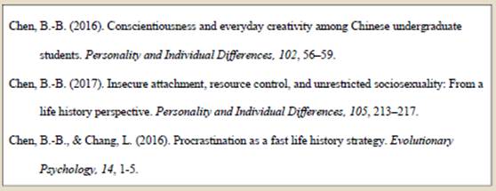 第一,先后顺序原则。第一级是按照英文字母的A、B、C、D的顺序排列作者名。第二级顺序是按照论文发表年份,从远到近。如果作者名字是一模一样的,就按照发表年份的先后顺序排列,发表越早的列在越前面。