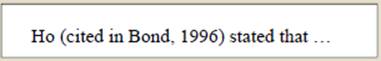 引用二手的资料。比如说你实际看到的文献是Bond在1996年的这篇文献,但你要引用的内容其实是从Bond的文章里面看到的Ho的观点。你把Ho这个人说了什么写下来的时候就要说明是引自Bond在1996年这篇文章或者书中的,这是引用二手资料的方式。建议大家在查阅文献的时候尽量去看一手资料,因为一手资料里面有更多的信息,只有在万不得已的情况下去引用二手资料。