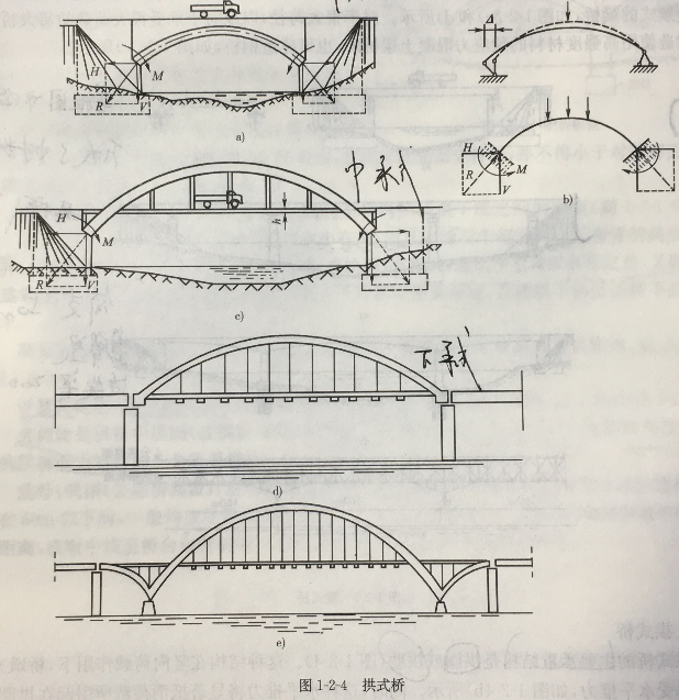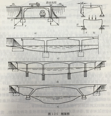 图1-2-4中还示出三种不同承式的桥梁。通常称车辆在主要承重结构(拱或梁)之上行驶者为上承式桥梁,如图1-2-4a)所示;车辆在主要承重结构之下行驶者为下承式桥梁,如图1-2-4d)所示;图1-2-4中的c)和e)则称为中承式桥梁。