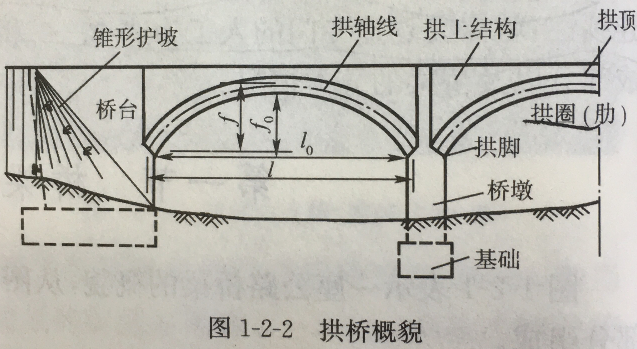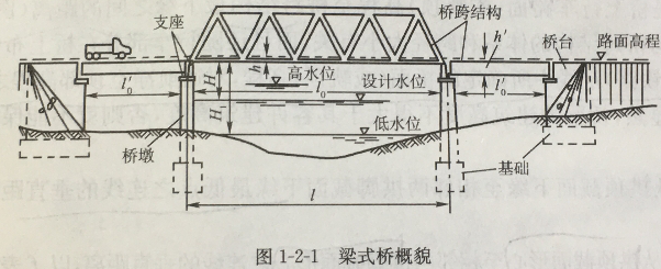 对于具有支座的桥梁,是指桥跨结构相邻及两个支座中心之间的距离,用\(l\)表示。对于图1-2-2所示的拱式桥,是两相邻拱脚截面形心点之间的水平距离。桥跨结构的力学计算是以\(l\)为基准的。