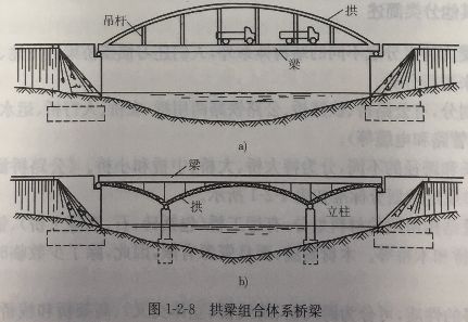 除了以上5种桥梁的基本体系以外,根据结构的受力特点,还有由几种不同体系的结构组合而成的桥梁,称为组合体系桥。图1-2-8a)所示为一种梁和拱的组合体系,其中梁和拱都是主要承重结构,两者相互配合共同受力。由于吊杆将梁向上(与荷载作用的挠度方向相反)吊住,这样就显著减小了梁中的弯矩;同时由于拱与梁连接在一起,拱的水平推力就传给梁来承受,这样梁除了受弯以外尚且受拉。这种组合体系桥能跨越较一般简支梁桥更大的跨度,而对墩台没有推力作用,因此,对地基的要求就与一般简支梁桥一样。图1-2-8b)所示为拱置于梁的下方、通过立柱对梁起辅助支承作用的组合体系桥。