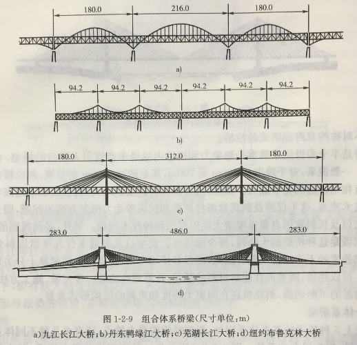 图1-2-9示出几座大跨度组合体系钢桥的实例。图1-2-9a)中所示是钢桁架和钢拱的组合;图1-2-9b)所示是钢梁与悬吊系统的组合;图1-2-9c)所示是钢梁与斜拉索的组合;图1-2-9d)所示是斜拉索与悬索的组合。