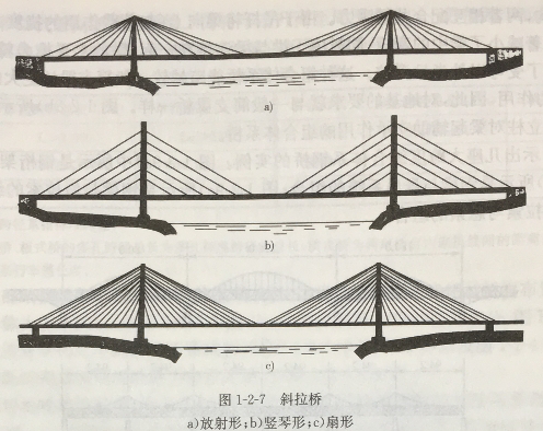 斜索在立面上也可布置成不同形式。各种索形在构造和力学上各有特点,在外形美观上也各具特色。常用的索形布置为竖琴形[图1-2-7b)]和扇形[图1-2-7c)]两种。另-种是斜索集中锚固在塔顶的辐射形布置[图1-2-7a)],因其塔项锚固结构复杂面较少采用。