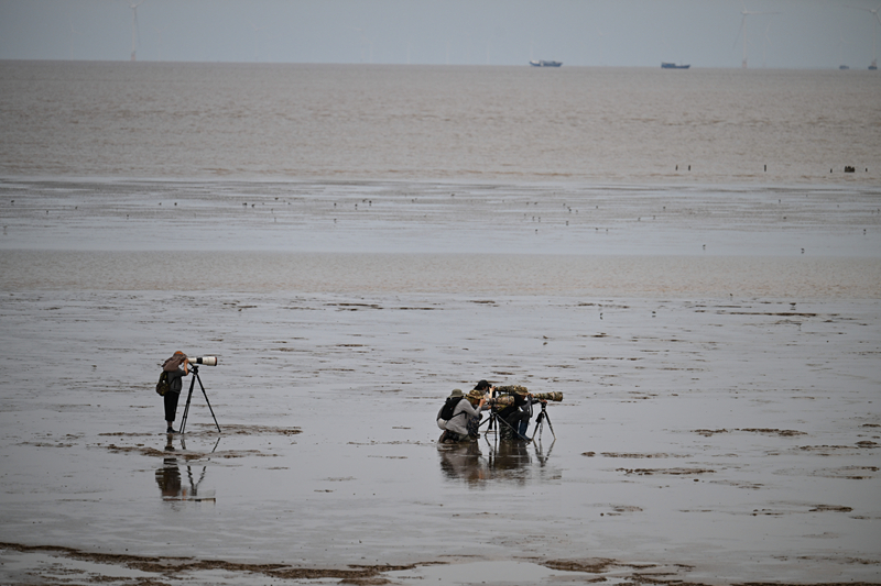 8月25日,摄影爱好者在东台条子泥湿地拍鸟。