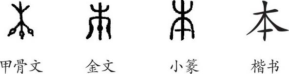 “本”是指事字。甲骨文上部是“木”(树)的枝干,下部是根部,三个小圆圈是指事符号,表示这里是树木的根部所在。金文、小篆基本延续了甲骨文的写法。隶变后楷书写作“本”。