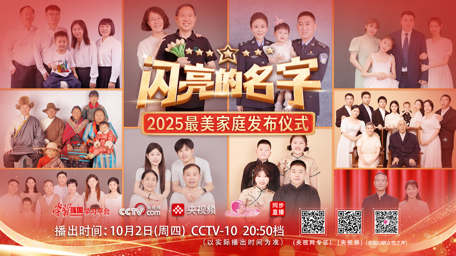 《闪亮的名字——2025最美家庭发布仪式》将在中央广播电视总台央视科教频道(CCTV-10)10月2日20:50档播出。播出期间央视频、学习强国、央视网、全国妇联女性之声等新媒体平台同步直播。