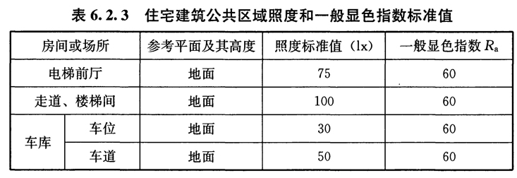 6.2.3 本条规定了保障住宅建筑公共区域视觉安全与视觉舒适的光环境要求。对于住宅建筑公共区域,为看清视野范围中的障碍物或潜在风险,降低危险发生的概率,提高光环境质量,应当根据场所活动特点对其照度和显色性进行规定。