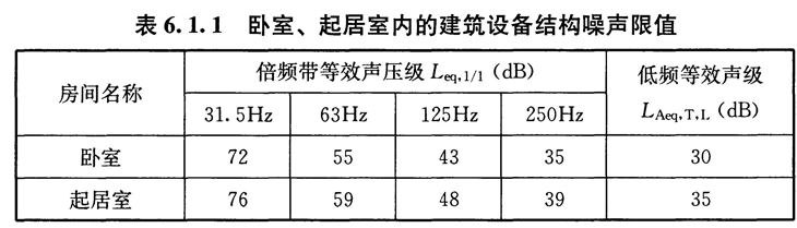 为了更合理地评价住宅建筑电梯、水泵、变压器等共用设施设备以及空调室外机、新风机组室外机等设备引起的建筑设备结构噪声,参考国外关于低频噪声的评价方法和频率范围,并结合我国相关标准规范,本规范采用中心频率为31.5Hz、63Hz、125Hz、250Hz的4个倍频带等效声压级和低频等效声级一并作为建筑设备结构噪声限值。