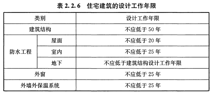 2.2.6 住宅建筑的设计工作年限应符合表2.2.6的规定,在规定设计工作年限内应满足安全性、适用性和耐久性要求。