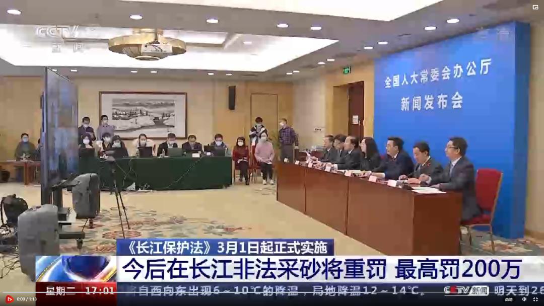 关注长江的保护。去年12月26日,十三届全国人大常委会第二十四次会议表决通过了《长江保护法》,3月1日起正式实施。长江保护法对长江流域的河道采砂作了严格规定,全国人大常委会举行专题新闻发布会,水利部相关负责人表示,对发生在长江流域的非法采砂行为,今后将采取重罚措施。