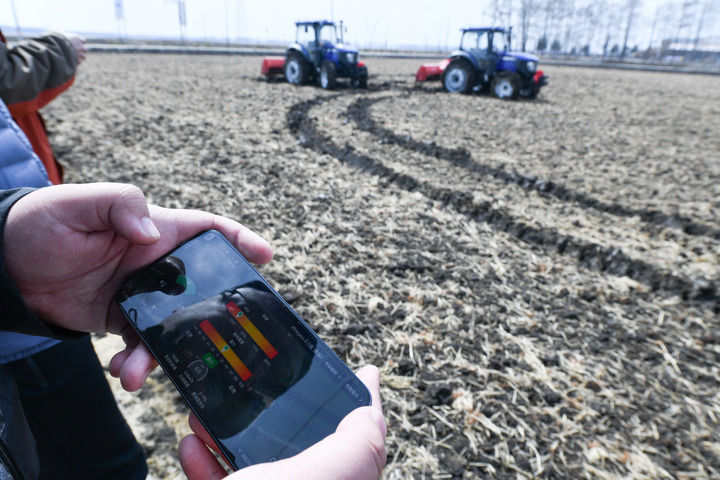 在黑龙江北大荒农业股份有限公司友谊分公司智慧农场的地块内,技术人员操作两辆拖拉机进行无人驾驶测试(2024年4月3日摄)。新华社记者 王松 摄