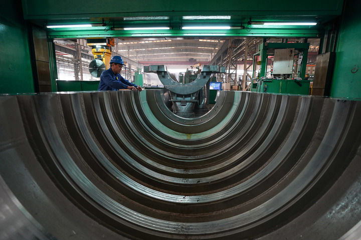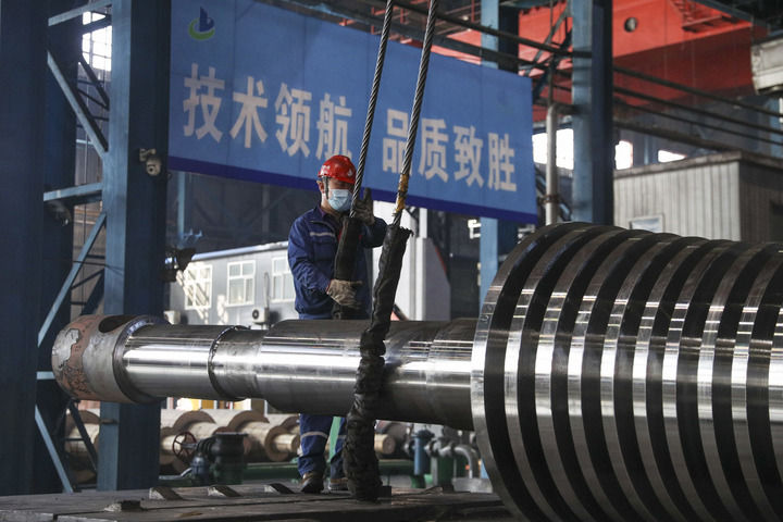 工人在位于黑龙江省齐齐哈尔市的中国一重集团有限公司生产车间运送产品(2024年3月5日摄)。新华社记者 张涛 摄