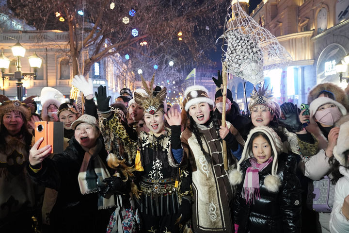 身着赫哲族服饰的赫哲族群众和饶河县文旅推荐官在哈尔滨中央大街与游客互动(2024年1月6日摄)。新华社记者 王建威 摄