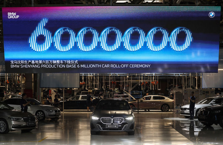在宝马沈阳生产基地拍摄的华晨宝马第600万辆整车下线仪式(2024年5月8日摄)。新华社记者 潘昱龙 摄