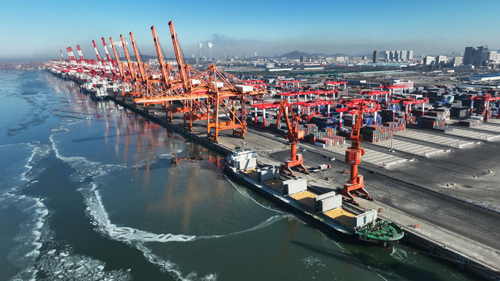 货船在辽宁营口港码头装运粮食(2024年1月10日摄,无人机照片)。新华社记者 杨青 摄