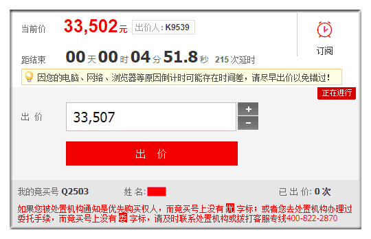 答:您交保成功后,即会生成竞买号(如下图),则代表交保成功。如果拍卖已经开始,那么原本报名交保证金的按钮会变成“出价”按钮,如果拍卖还未开始,报名交保证金的按钮会变为“等待开拍”按钮,拍卖开始后会变为出价按钮