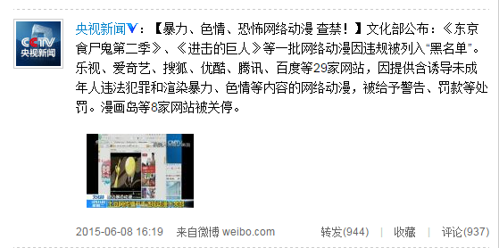 据“央视新闻”官方微博消息:“文化部公布:《东京食尸鬼第二季》、《进击的巨人》等一批网络动漫因违规被列入“黑名单”。乐视、爱奇艺、搜狐、优酷、腾讯、百度等29家网站,因提供含诱导未成年人违法犯罪和渲染暴力、色情等内容的网络动漫,被给予警告、罚款等处罚。漫画岛等8家网站被关停。”
