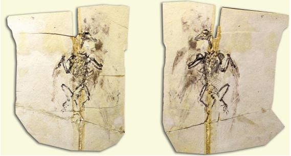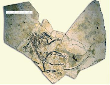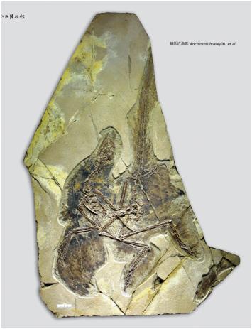 万年。赫氏近鸟龙化石在其骨架周围清晰地分布着羽毛印痕,特别是在前、后肢和尾部分布着奇特的飞羽,这种特征在灭绝物种中还尚无先例。它填补了恐龙向鸟类进