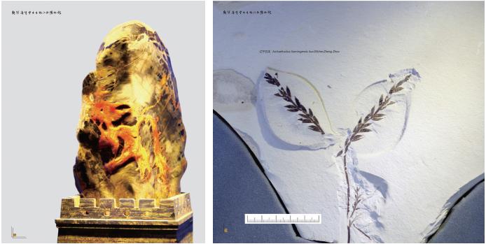 )植物厅。很长一段时间内,由于对植物化石的发现和了解不多,所以热河生物群中植物的研究起步较晚,但也取得了不少成绩。已经发现的植物化石有苔藓、蕨类、银杏、苏铁、松柏类和开花的植物。其中,银杏、苏铁、松柏类尤其丰富。被子植物也正是从这一时期才开始出现的,著名的种类有辽宁古果、中华古果。