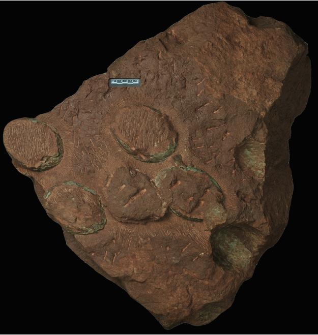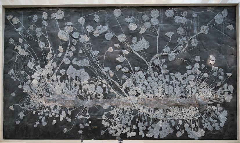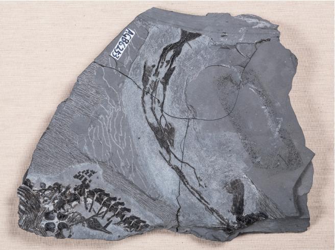 亿年的晚三叠世地层中,为海百合群体与寄生木共存的化石标本。