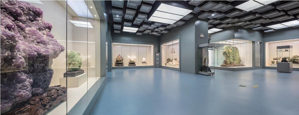 )矿物岩石厅。矿物岩石厅以“精美的石头”为主题,介绍矿物岩石的分类、物质组成、结构构造的基本知识,展示自然界中天然形成的各种美丽的矿物岩石。展厅分观赏石和宝玉石两个展区。从矿物岩石基础知识的介绍入手,从人文美学角度让人们认识、欣赏各种精美的矿物岩石。
