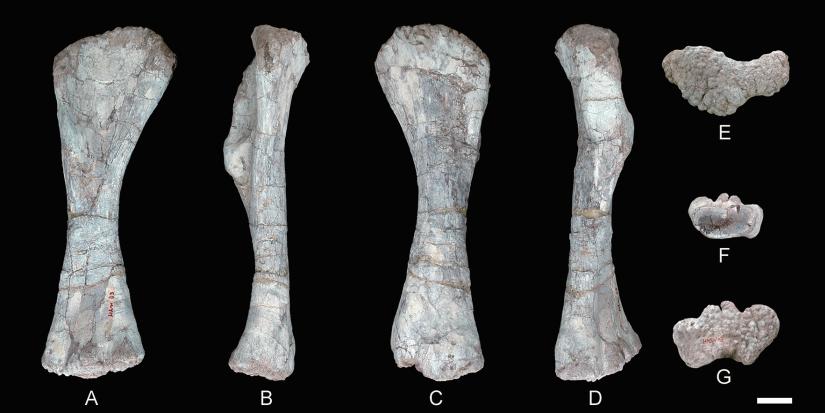 ,尺骨两臂突中的内前突更长,尺骨远端前面、外后面和内后面上都有棱嵴发育。