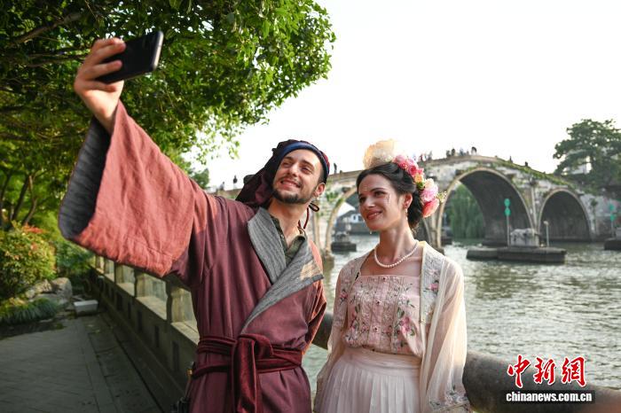 2024年6月,国际友人在杭州拱宸桥前自拍留念。王刚 摄