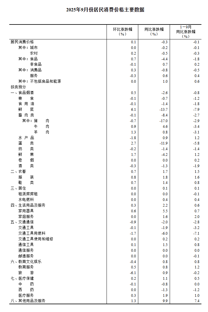 国家统计局:9月份居民消费价格同比下降0.3% 环比上涨0.1%