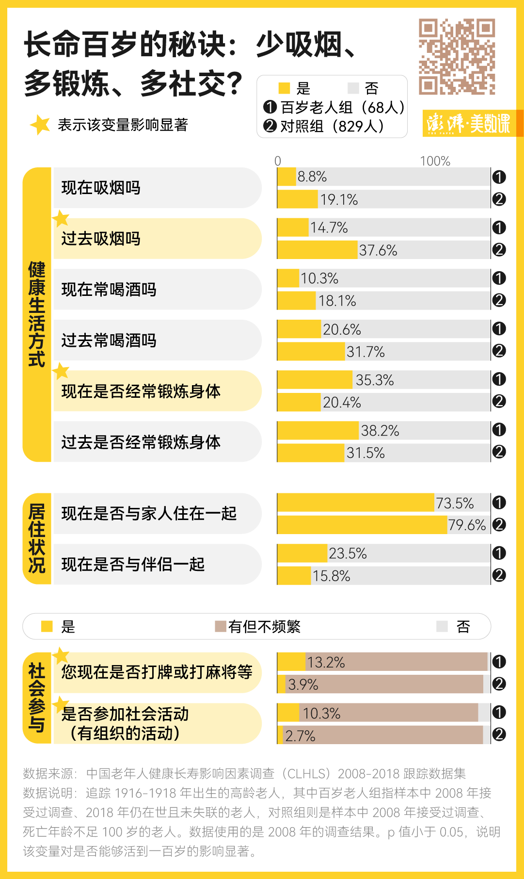 结果显示,从不吸烟、经常锻炼和高社会参与度能显著提高成为百岁老人的概率。