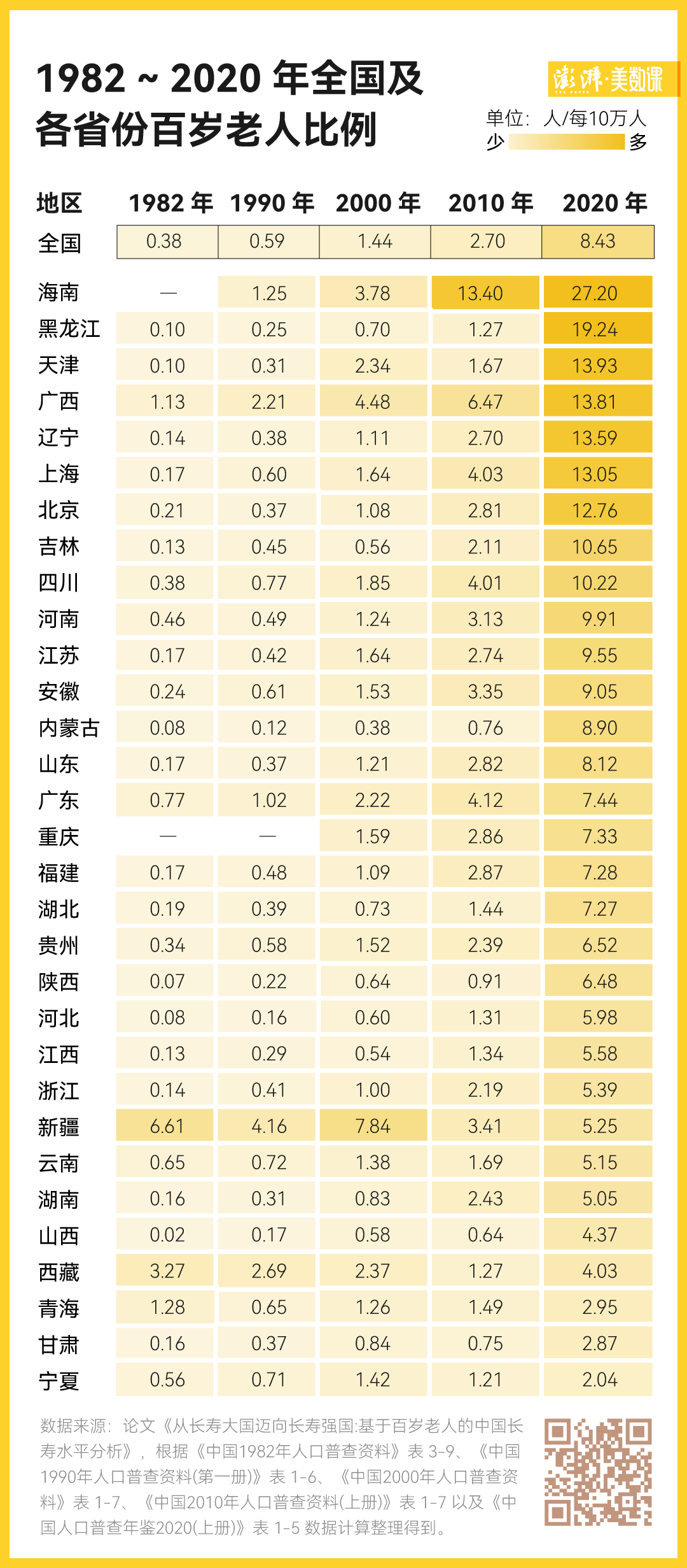 研究发现,2020 年,全国每 10 万人中就有 8.43 个百岁老人。高于这个平均水平的 13 个省份中,东部地区占 5 个,东北地区占 3 个,西部地区占 3 个,中部地区占 2 个。 其中,海南每 10 万人中百岁老人数量高达 27.20 人,居于首位,比第二名黑龙江高出约 40%;排在后面的五个省份(天津、广西、辽宁、上海、北京)则紧凑地分布在同一个档位里,每 10 万人中有 13 至 14 位百岁老人。