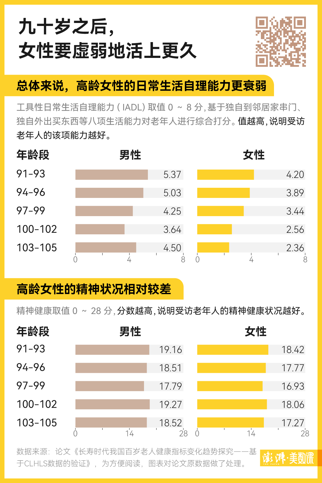 北京大学的一篇论文指出,虽然高龄老人和百岁老人群体中女性老人的比重大于男性,但男性老年人的健康状况总体上要好于女性老年人。 CLHLS 调查中评估了老年人的八项生活能力,如独自到邻居家串门、独自外出买东西等,为老年人的“工具性日常生活自理能力”进行综合打分,同时还评估了老人的精神健康。该论文对这些数据进行了综合分析,在控制了性别变量后发现,整体上女性高龄老人的健康状况要明显差于同一时期男性老人的健康状况,男性老人的身体状况和精神状况都更好。