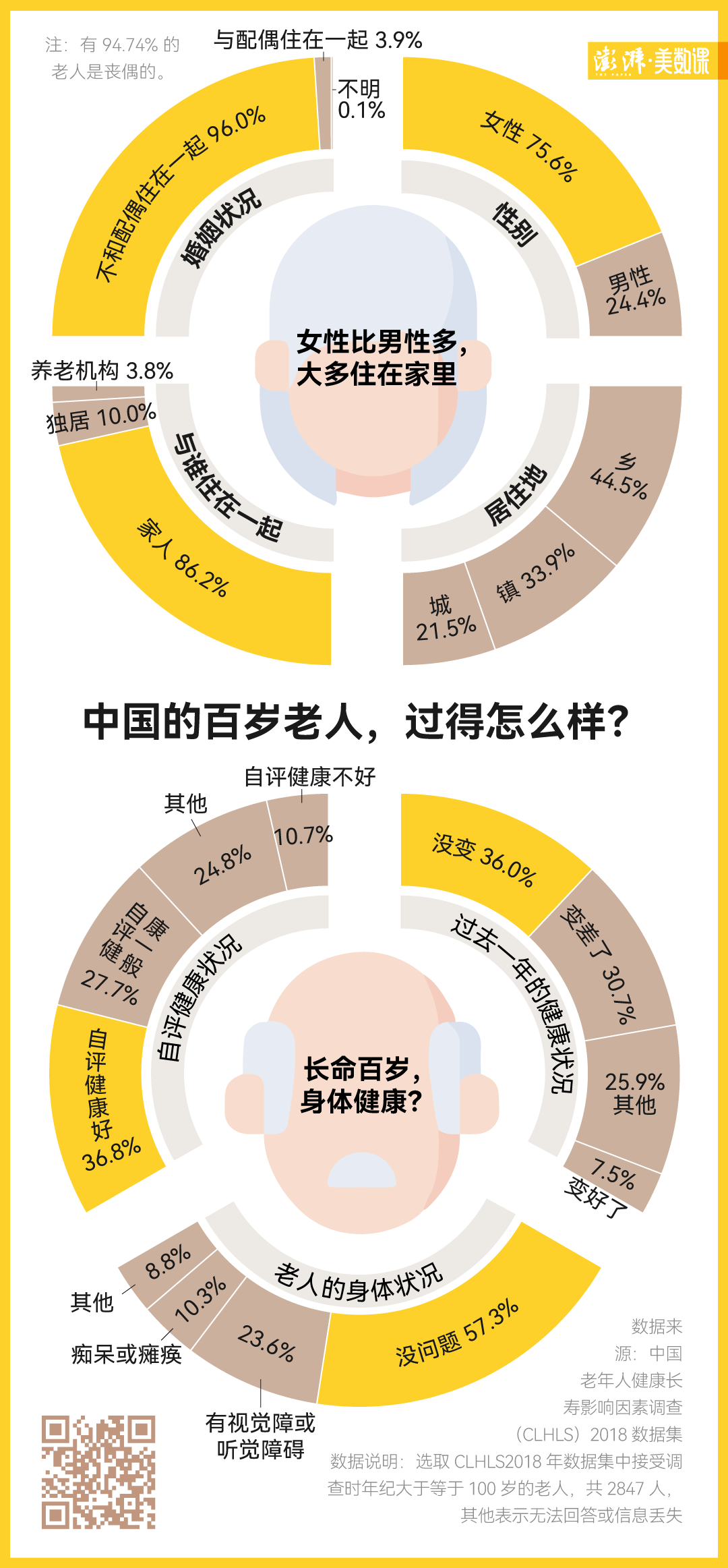 当人活到 100 多岁,有一件事几乎是确凿发生的——丧偶,在 2018 年接受调查的这批百岁老人中,有 94.74% 的老人的伴侣都去世了。中国人口与发展研究中心发布的《中国老年健康和家庭幸福影响因素跟踪调查(2021 年)》指出,接受调查的老人中,八成老人的日常生活照料由家庭成员提供,其中有一半来自儿子和儿媳。社会服务和养老机构提供的照料服务约占 5.32%,保姆提供的照料约为 5.44%。80 岁之前,提供照料的主体是配偶,80 岁之后,子孙照料比重快速升高,配偶照料快速减少。