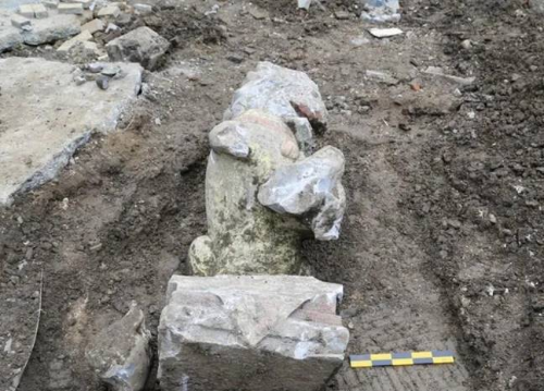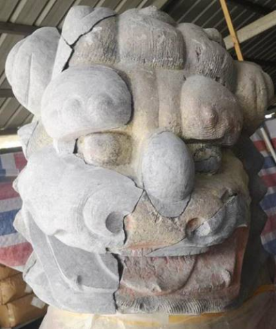 刚出土的石狮损伤严重,头部面部已大面积缺失