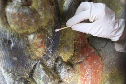然后为进一步精细处理和防止彩绘脱落,使用固含量 1 %的浙大ZD 303 加固液进行表层预加固,接着用特细颜料笔和棉签精细清理泥垢,对顽固泥垢进行了反复润湿和擦洗,直到清晰的色彩显现。